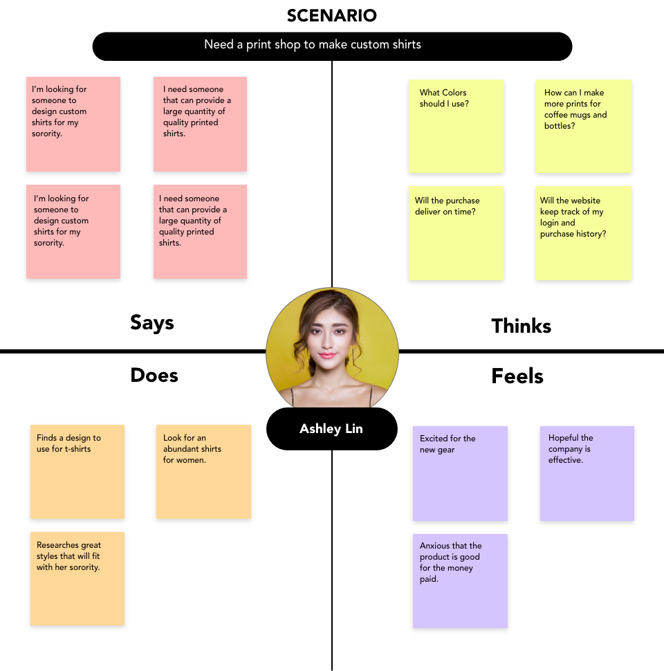 I implemented an empathy map that can help me identify what the user will say, think, feel, and does. I used Ashley Lin as an example of someone who is part of a sorority and is looking to create custom shirts for her sorority sisters. She has been looking online for the best businesses that are either around her or have a great rate. This empathy map showcases that Ashley needs a company that will be good in quality and supplies her with a bundle of apparel. How did I understand who Ashly is and what can help me help her design a website that compliments her needs? That's what empathy helps me with and aims to be helpful when coming up with a design.