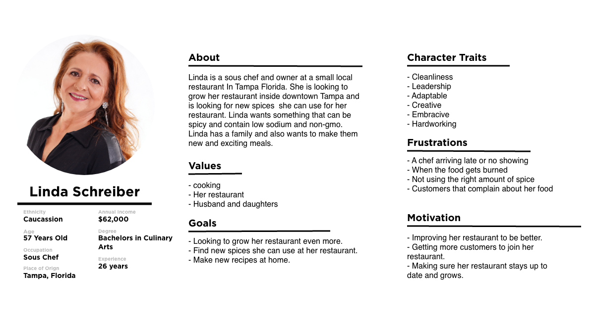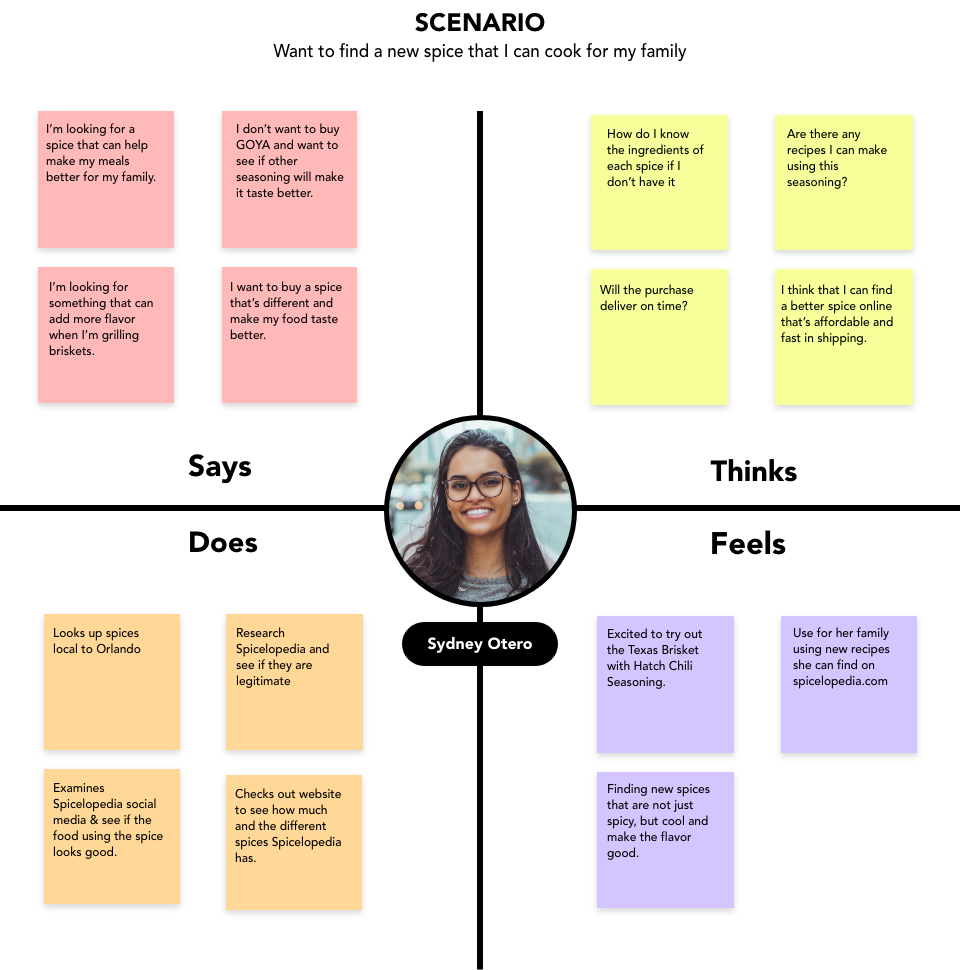 Let's say there is a woman named Syndey Otero, who falls under the category of a casual chef or mostly is looking to cook for fun and her family mostly. Syndey is looking for a spice that is spicy and can be used for briskets to grill. She may like a certain spice that caters to exactly what Sydney wants to cook for herself and her family which will spice things up. I can now empathize with Syndey and help evaluate what I need to make a design that caters to Syndey and people like Sydney. Now that I can empathize with a user I want to create user profiles that can help me even more.